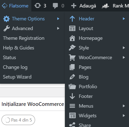 Când mergeți cu mouse-ul pe el, vă va apărea o listă cu toate secțiunile pe care puteți merge. Dați click pe „Theme Options” > „Header” .