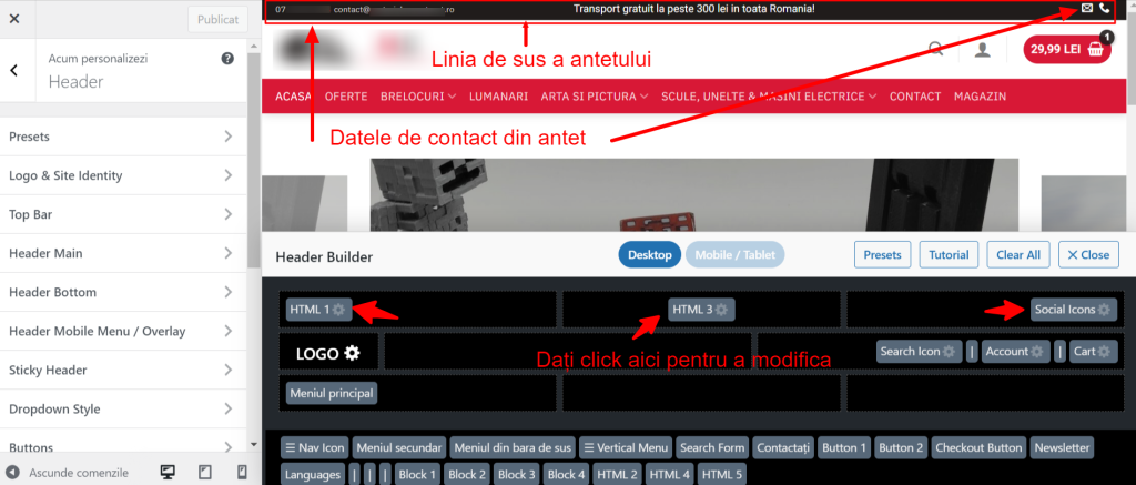 Pentru a modifica numărul de telefon, adresa de email și linkurile butoanelor acestora, dați click pe „HTML 1” (pentru text) și apoi pe „Social Icons” (pentru butoane). De asemenea, puteți schimba textul „Transport gratuit la peste 300 lei in toata Romania!” dând click pe „HTML 3”.