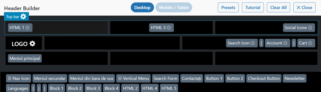 Dacă veți merge cu mouse-ul deasupra primului rând din editorul „header builder”, vă va apărea butonul „Top Bar”, dați click pe el (această secțiune poate fi accesată și din meniul lateral, al treilea rând, după cum ați văzut în imaginea de mai sus).